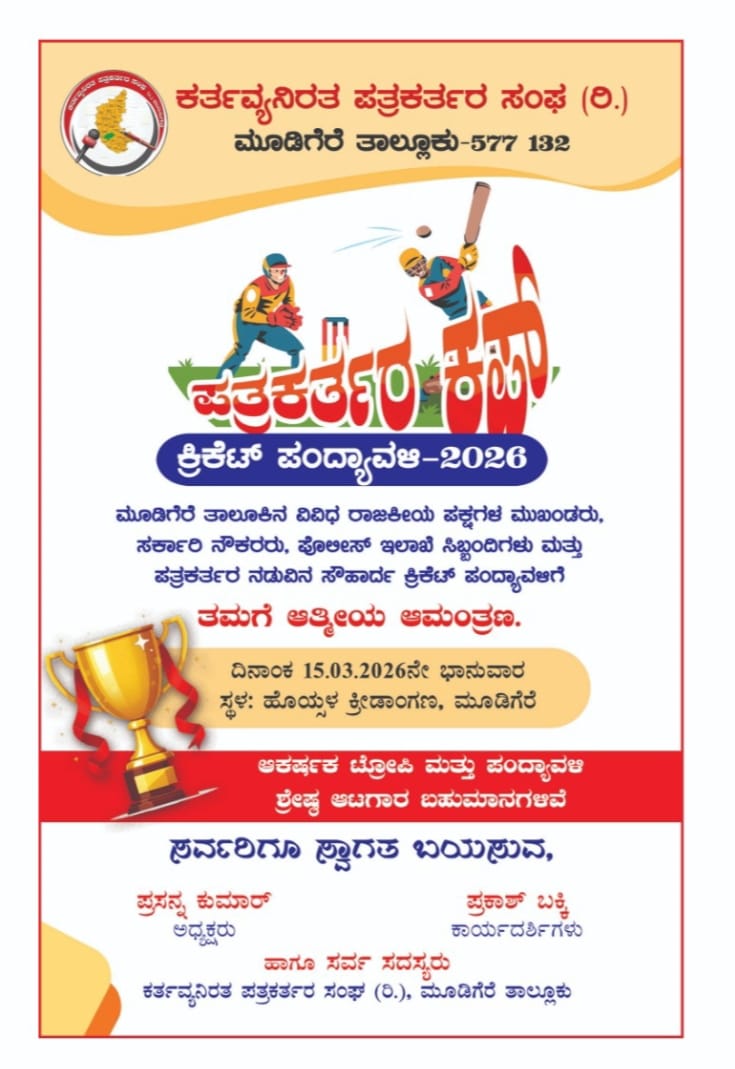 ಮುಂದಿನ ಭಾನುವಾರ ನಮ್ಮ ಸಂಘದಿಂದ ಕ್ರಿಕೆಟ್ ಪಂದ್ಯಾವಳಿ ಏರ್ಪಡಿಸಿದ್ದು ಇದರಲ್ಲಿ 7 ತಂಡಗಳು ಭಾಗವಹಿಸುವ ಬಗ್ಗೆ ನೊಂದಾವಣೆ ಮಾಡಿದ್ದಾರೆ ನಮ್ಮ ಸಂಘವು ಸೇರಿ ಎಂಟು ತಂಡಗಳಾಗುತ್ತದೆ. ಚಿಕ್ಕಮಗಳೂರಿನ...